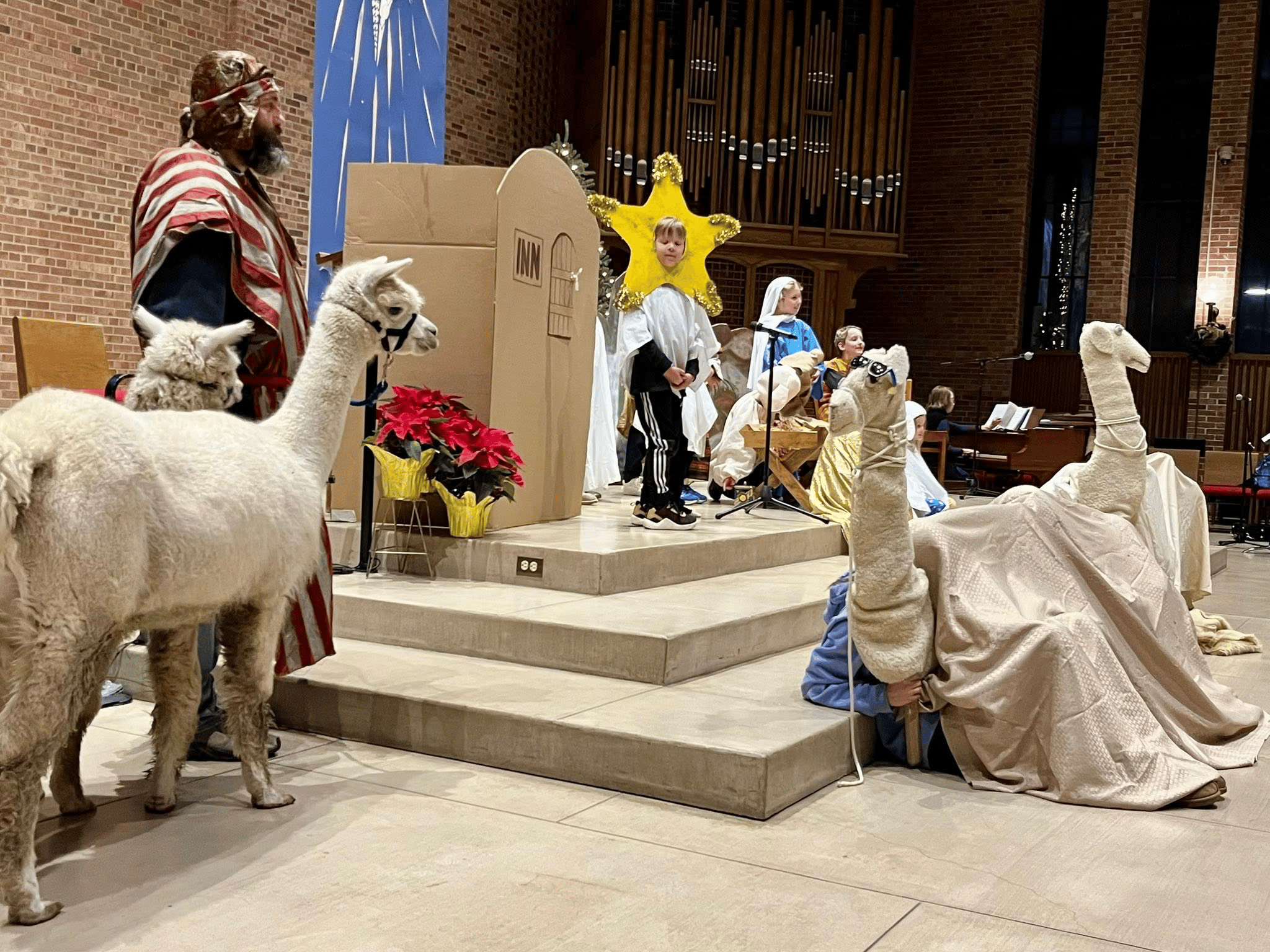 A special thank you to everyone who participated in the Christmas Pageant. The alpacas--Annie and Oakley--played their parts well, as did the shepherds, sheep, barnyard animals, stars, kings, camels, and, of course, Mary and Joseph. Thanks, Jeremy and Crew! And all who made it happen behind the scenes: Paula, Diane, Ashlynn, Charlie, Kathryn, Jesse, and Pastor Donna.